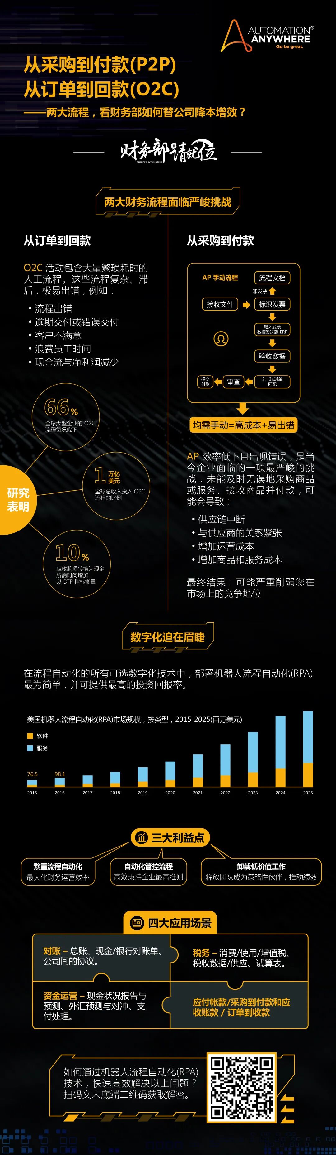 以下长图为你厘清从采购到付款(P2P)和从订单到回款(O2C)两项财务工作中的常见挑战及RPA的相关应对方法。扫描图中二维码或点击阅读全文,获取Automation Anywhere白皮书,RPA好处全知道。