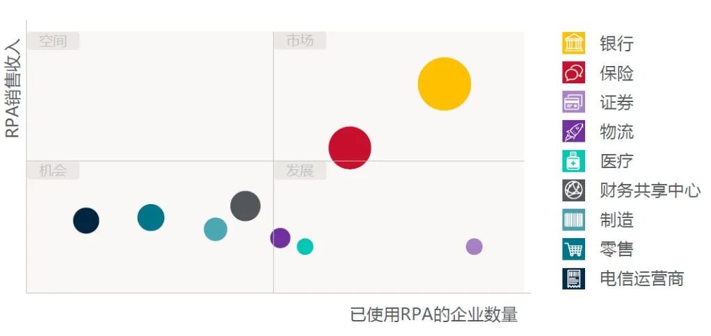 以制造业与能源业为例,根据报告调查结果,制造业仅尝试在财务部和人力资源部部署RPA,能源业也仅仅涉及了财务和IT两个职能。但对于这两个传统行业而言,在供应链的数据运用和效用分析、销售和CRM管理、库存管理等方面,RPA比人工更擅长深入挖掘、精确分析。对于这些场景,国内的RPA软件还有很大的研发和推广余地。