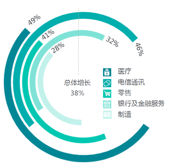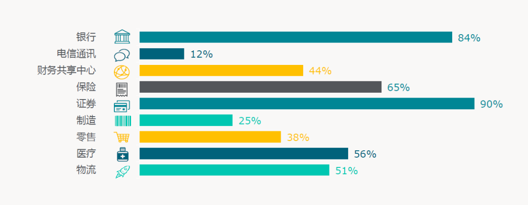 受访企业中,已经使用RPA的公司面对逐步提高的工作效率和更精准的数据分析结果,基于降本增效的理念,对未来的销售收入有了更大胆的预期。其中医疗行业预计在使用RPA后,将提高销售收入达49%。