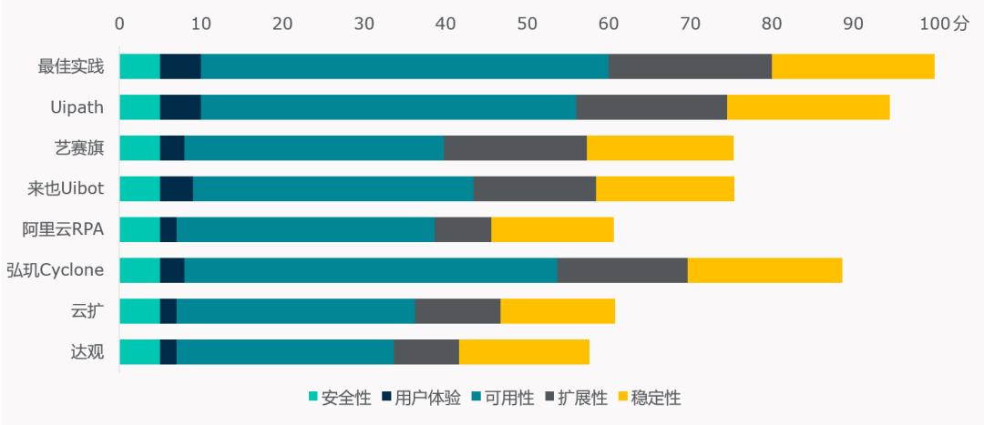 毫无疑问的,UiPath在各个维度的卓越表现,成为最接近理想状态的RPA产品;艺赛旗因其较为广泛的影响力和不断的版本更新,现在也逐步趋向于一个成熟的RPA产品;云扩的产品尚无公开版,在我们可以测试的版本中还有很多功能有待改进;阿里云的产品从码栈更名为阿里云RPA,刚刚纳入阿里云平台体系,暂时没有很好地面向所有企业;而令人意外的是弘玑Cyclone,虽然是很年轻的RPA产品,但在测试中各方面的表现都不俗,甚至在产品层面远优于已经在市场上非常活跃的国内其他产品公司。