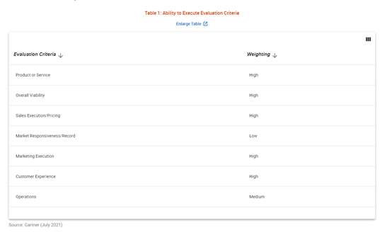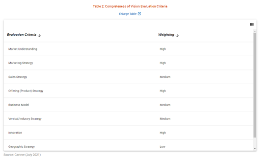 本次魔力象限评选维度包括:产品服务、创新能力、市场能力、营销能力、客户体验、产品操作、发展战略、商业模式、垂直战略、市场战略等。