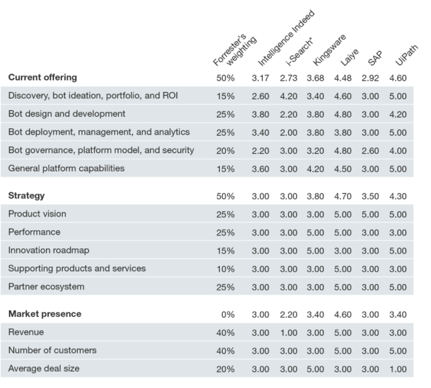 RPA作为其主要业务或单一重点:每家供应商都必须证明其专注于为其客户提供 RPA 功能。在 Forrester Wave 流程中,要求每家供应商提供三个客户参考,代表不同行业和公司规模,并且RPA软件已投入生产至少六个月。