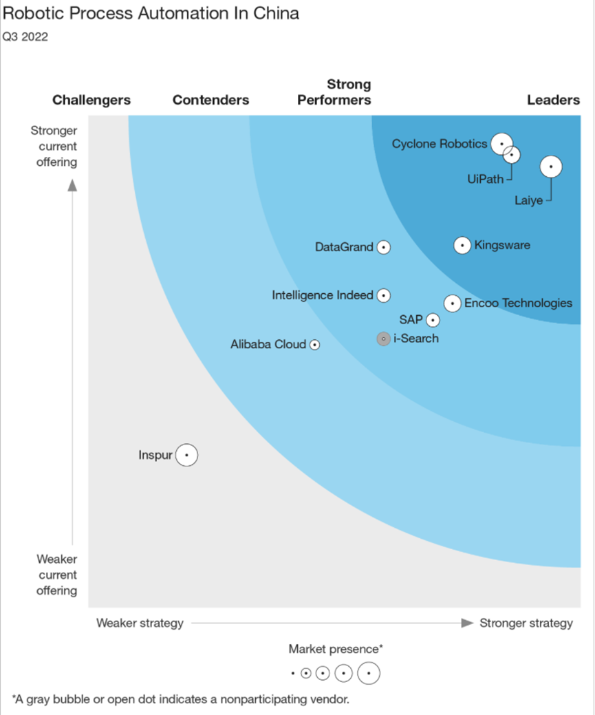 7月11日,全球著名咨询调查机构Forrester发布了“Robotic Process Automation In China,Q3 2022”调查报告。通过产品能力、年收入、客户服务、市场占有率等26项标准,对11家中国RPA厂商进行了深度评估。
