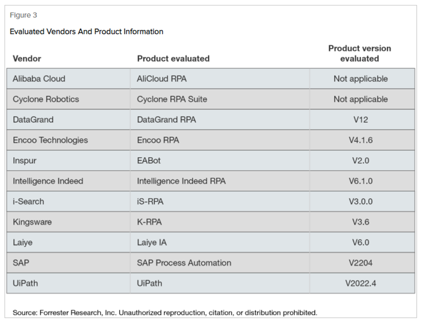 未经允许不得转载:RPA中国 | RPA全球生态 | 数字化劳动力 | RPA新闻 | 推动中国RPA生态发展 | 流 > Forrester发布2022年Q3中国RPA厂商报告:11家企业上榜