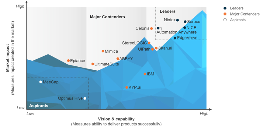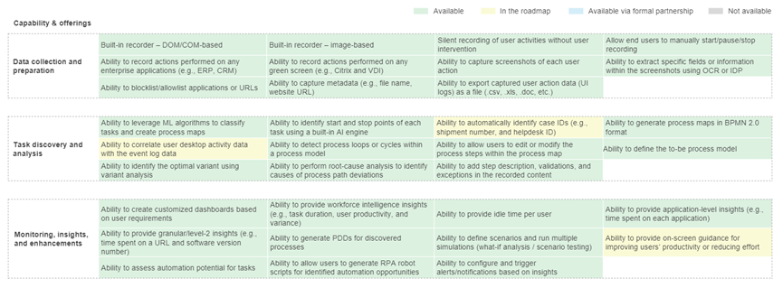 比较有趣的是,在行业领导者领域只有Soroco一家是纯粹的任务挖掘厂商,而在主要竞争者领域也是提供RPA、IDP、智能自动化技术的厂商居多。这从侧面反映出任务挖掘已破圈,受到了软件自动化行业的青睐和认可,并将其集成在产品矩阵中。