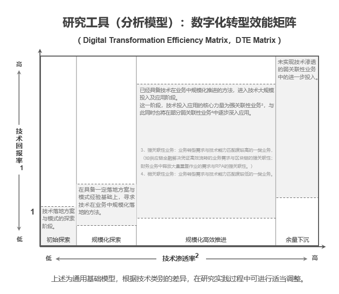 1、本次报告将对中国RPA落地现状进行深入洞察分析,运用数字化转型效能矩阵(DTE Matrix)分析模型,以“技术回报率”和“技术渗透率”两大维度对数字化转型效能进行综合定义。