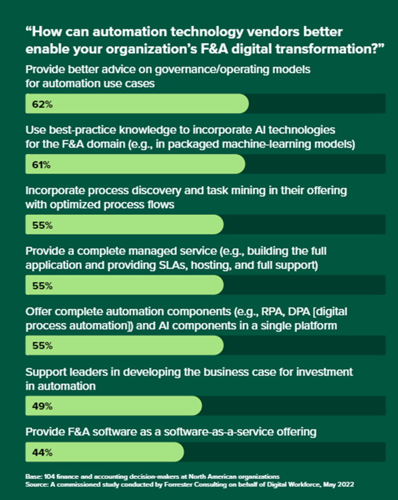 自动化技术供应商在组织对其F&A流程进行数字化转型方面发挥着关键作用。超过60% 的受访F&A领导者表示,他们主要需要自动化技术供应商提供有关治理和人工智能的建议。