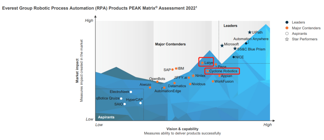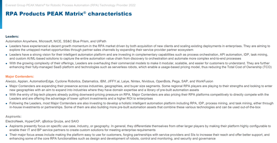 其中,UiPath、Automation Anywhere、微软、NICE、SS&C Blue Prism(原Blue Prism)被评为行业领导者;