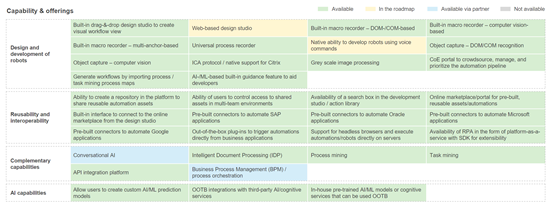 技术方面,大多数主要竞争者通过内部投资或合作伙伴关系,进一步增强其智能自动化平台,包括:对话式AI、IDP、流程挖掘和任务挖掘等。同时一些厂商还在构建更多开箱即用的自动化库,以进一步降低用户构建自动化流程所需的时间和成本。