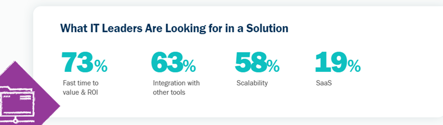 73%受访者表示,能否快速实现商业价值和提升投资回报率是选择自动化解决方案的关键因素。63%表示,能否与其他工具集成;58%表示,自动化的可扩展性。