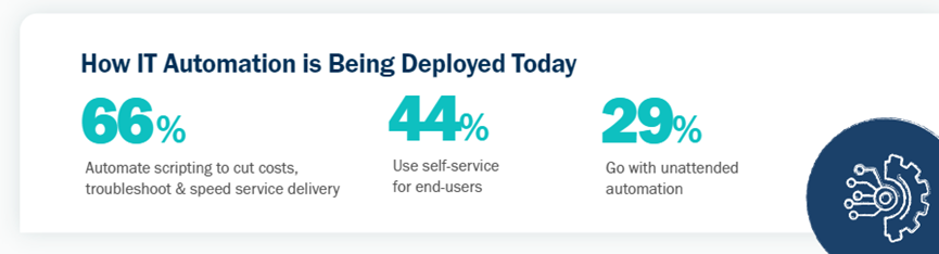 在自动化使用方面,通常脚本是应用最多的自动化方式之一。它可以简单、快速的将数字化业务流程实现端到端自动化,但IT决策者应该警惕数据安全性问题。66%受访者表示,主要通过自动化脚本方式部署自动化、降低成本和加快自动化项目交付;29%表示,使用无人值守自动化。