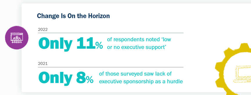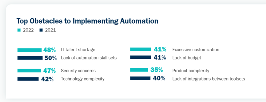 对于自动化的应用,在2022年,只有11%的受访者表示,缺乏高管支持是一个重要因素。这说明对于自动化应用得到了多数决策者的认可,并将其列为重要战略技术之一。