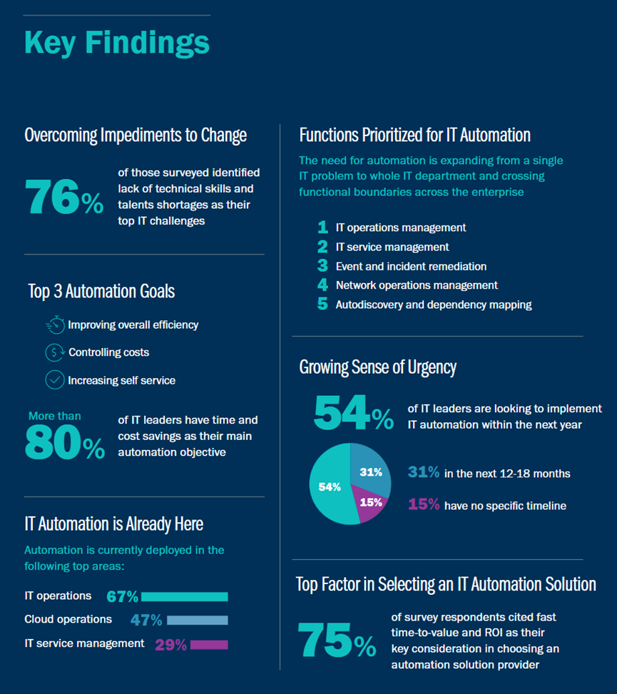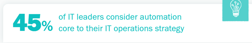 目前,全球组织正面临巨大的商业压力,而自动化几乎可以为所有IT业务流程创建自动化,帮助决策者们缓解压力并提升前进的动力。45%的受访者表示,将自动化视为IT运营战略的核心技术。