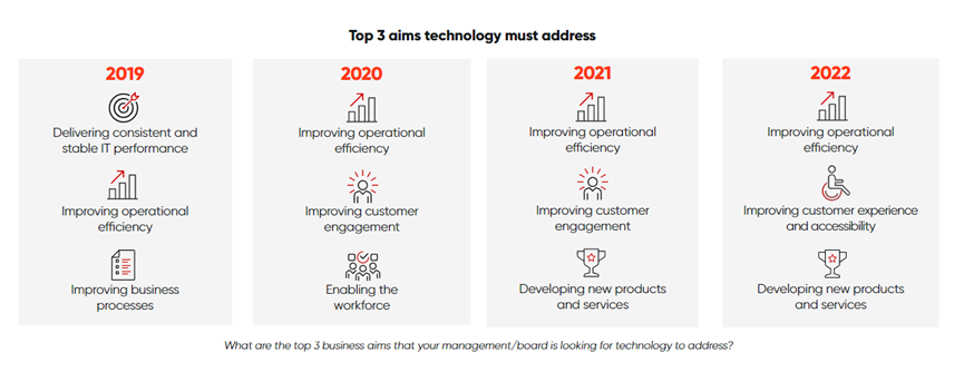 随着疫情持续肆虐,全球经济环境动荡,通货膨胀急速提升等不利因素,致使全球供应链遭受了前所未有的打击。因此,组织在投资技术时必须要求其能提供—提高运营效率、改善客户体验和可访问性、开发新产品和服务三大目标。