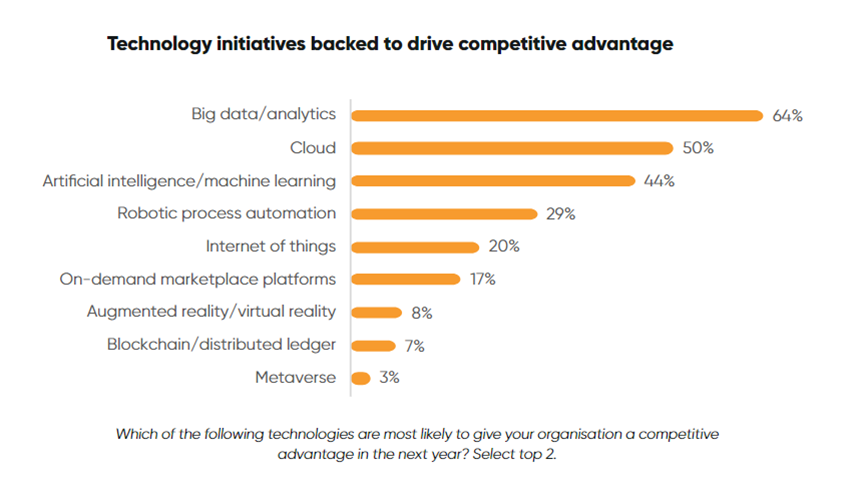 29%的数字领导者表示,RPA(机器人流程自动化)可以在明年提供竞争优势的技术。明显高于物联网、AR/VR、区块链、元宇宙等技术。