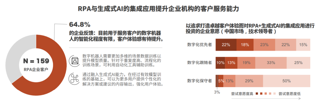 RPA与生成式AI的集成将构建更卓越的智能自动化能力,至2026年,35%的大型RPA企业用户将利用这项能力提升客户服务效能。