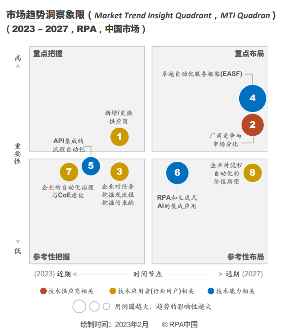 MTI Quadran将此趋势纳入“重点布局”类别。新一轮的市场竞争实则是RPA行业升级的表现:越来越多的客户对流程自动化的应用实践提出了更高的期望和要求、供应商的综合竞争力也将在客户需求和市场竞争中不断提升。