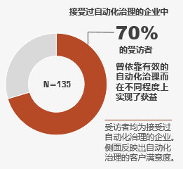 根据近期的研究,在接受过自动化治理的企业中,70%的企业因此而获益,30%未获益者的主要原因在于其没有实施有效的自动化治理(如没有合理评估各部门的自动化需求而进行机器人的使用分配而造成机器人的利用率低)。有远见的企业(尤其是大型企业)在RPA实施之前便开始了有效的自动化治理并建立了适合企业自身的规划。自动化治理引导企业以业务需求为导向来确定自动化工具的选择,而非以技术工具为核心探寻业务落地方式。