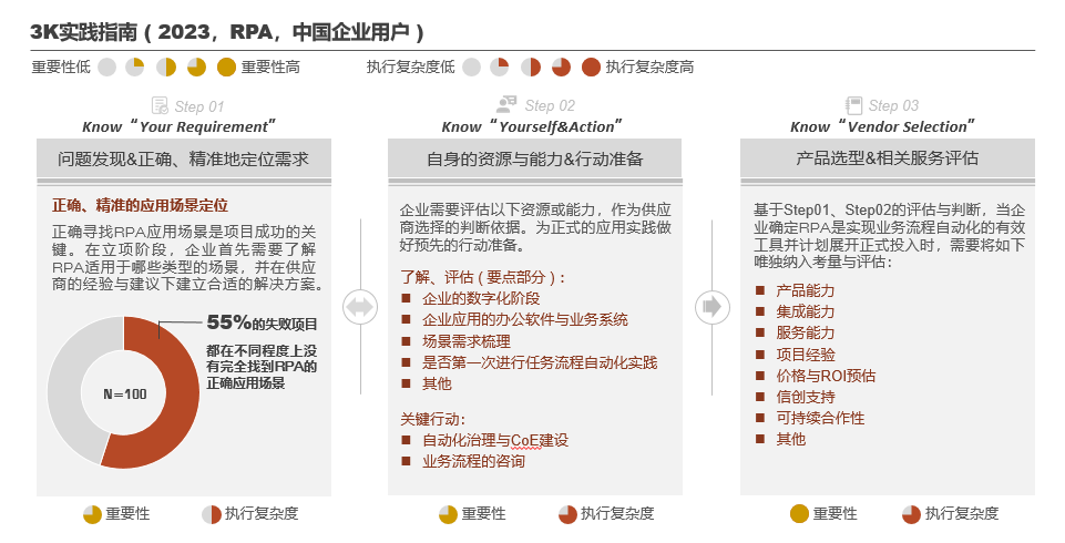 3K(Know Your Requirement、know Your Resources and Capabilities、Know Product Selection)实践指南是RPA中国研发的一项技术实践概述性思路与指导框架。我们将利用3K实践指南(2023,RPA,中国企业用户)来帮助企业客户构建完整的任务流程自动化实践框架、解读相关注意事项。