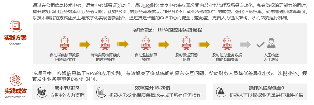 容智信息在该业务中,搭建了可监管、审计安全的财务平台;通过主动式监控,实现对业务的及时响应与维护。客户对容智信息的产品与解决方案能力给予了高度认可。容智信息与该证券这一实践案例的另一个代表性优势在于其有效打通了多系统的接口,可以释放多部门的人工劳动力。再者,容智信息还从组织管理与职能协同的角度帮助客户构建了CoE中心,这也将让客户可以更好地实现体系化的流程自动化实践。整个案例在同类型的证券机构中具备可借鉴意义。