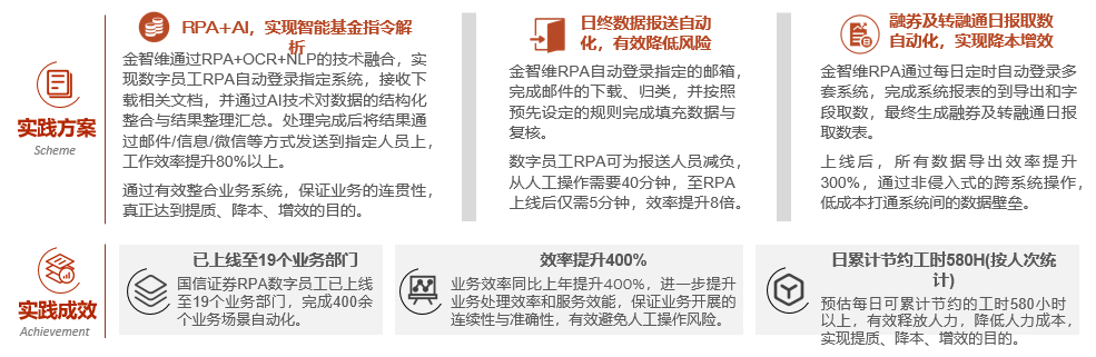 80%的RPA证券机构客户大幅度提升了业务效率同时,降低了信息录入或数据处理的错误率,RPA已帮助证券机构中的领先实践者降低了30%~40%的运营成本。