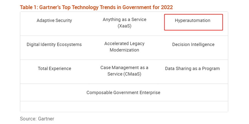 延伸阅读:Gartner在《2022年政府10大技术趋势》报告中,解读超级自动化技术为什么对政府机构很重要。