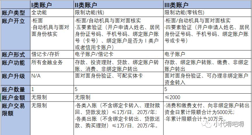 有人打了个有趣的比方:Ⅰ类账户就像是老婆用的,什么金融业务都能办;Ⅱ类账户就像是自己用的,只能投资理财缴费不能超额;Ⅲ类账户就像是给小孩用的,只能做一些小额支付。