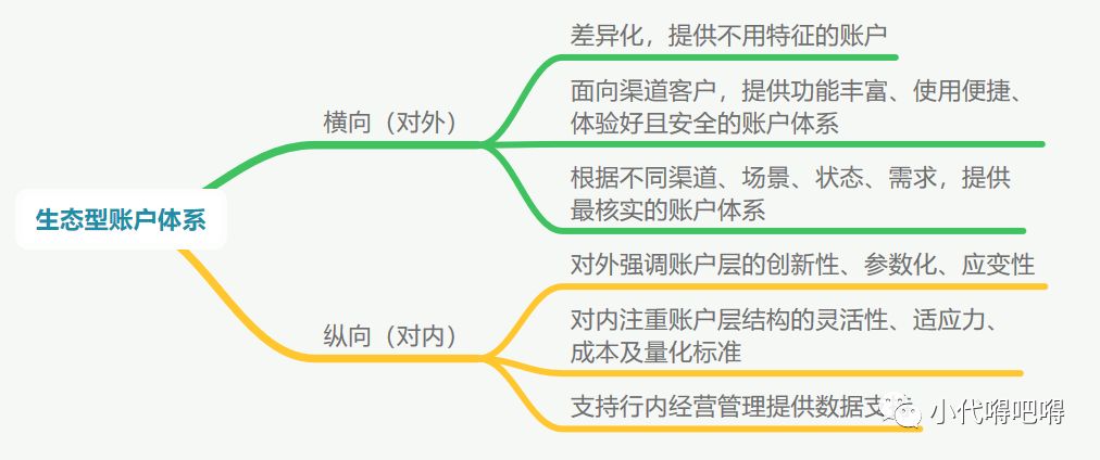 生态型账户体系重点在于多维度的差异化。面向外部市场环境,需要产品创新灵活、易于融入生态场景、推出市场速度快、风险定价灵活;面向机构,需要对接方式灵活、安全稳健、资金托管、定制化服务;面向客户,需要功能多样、方便快捷、安全可靠、强调体验;面向内部业务合作,需要结构设计灵活、适应能力强、系统对接灵活且成本低、指标可量化。