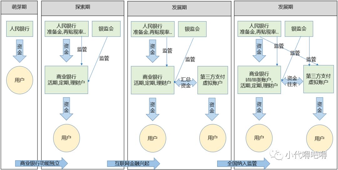 回顾银行账户体系发展,大致分4个阶段:萌芽期、探索期、规范期、成熟期。