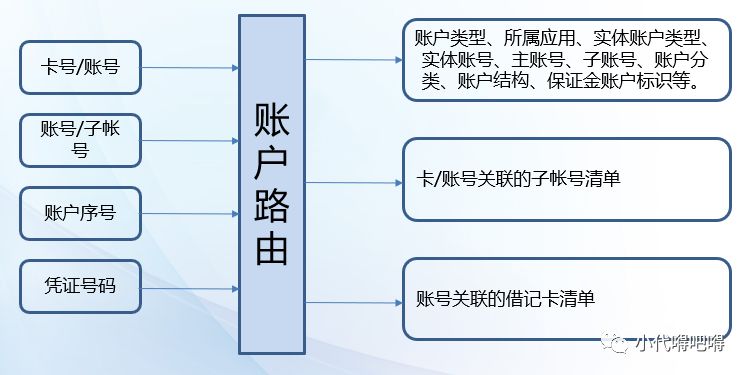 基于以上账户体系结构,系统需要提供账户路由构件或接口,供核心系统内或外围系统查询输入卡号/账号的账户属性,以及卡/账号关联的子帐号清单、账号关联的借记卡清单等功能。