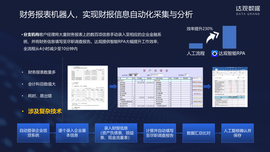在这个场景下,达观提供了“RPA+OCR+自然语言处理”的解决方案:首先通过OCR技术将财务报表扫描件转换成电子文件,再使用自然语言处理技术识别同义词,最后再用RPA实现信息的自动化采集和尽职调查报告财务分析的自动生成。在机器人的帮助下,财务报表采集和分析的时间从几小时降低到10分钟以内,效率显著提升。