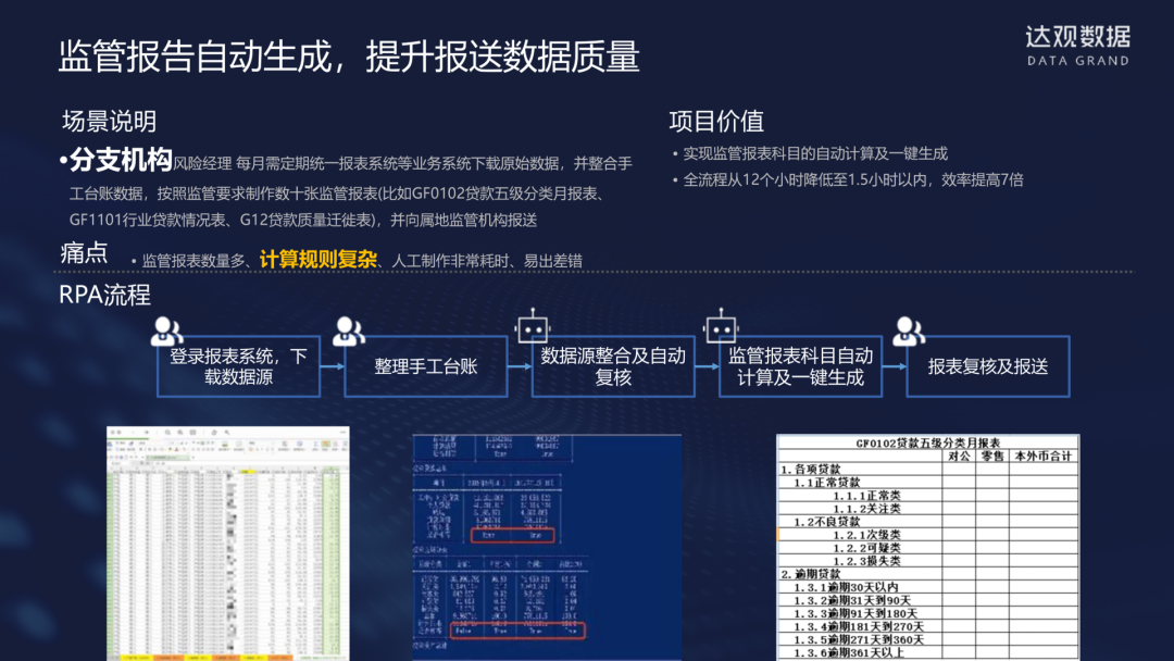 在这个场景中,达观提供了RPA智能机器人自动化解决方案,实现了数据源的自动汇总与复核,并按监管要求自动生成监管报告,可以把监管报告的流程从12小时降低到1.5小时内,效率提升7倍。