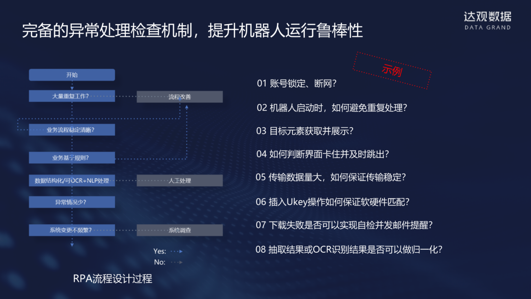 陈文彬:除了前面分享时提到的在流程设计时里加入流程异常处理机制,例如延时等待、循环判断等处理步骤,达观RPA也是一款企业级的自动化RPA产品,机器人在PC前端的执行情况,日志信息会同步到机器人管理后台,当某一台机器人执行过程中出现异常,也可以通过管理后台触发备用机器人开展自动化流程的相应操作。这也是达观RPA鲁棒性、稳定性方面的体现。另外,达观RPA可以支持机器人执行过程的全程录屏,实现机器人操作流程的可回溯,满足客户审计和分析的需求。