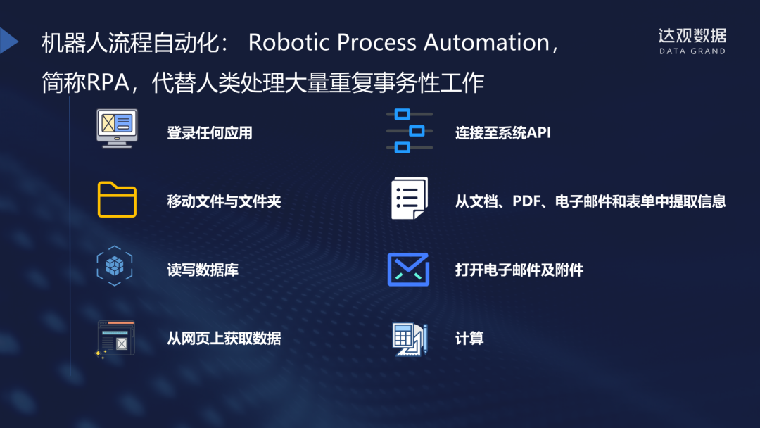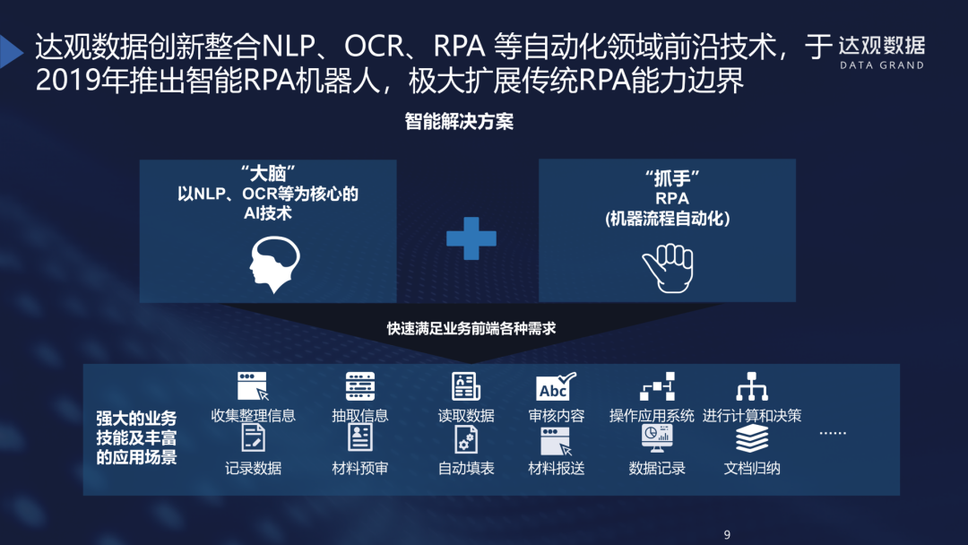 通俗地讲,自然语言处理技术可以帮人类更好的处理文档资料。达观结合自然语言处理领先优势,同时也是对自动化行业趋势的判断,把自然语言处理(NLP)和光学字符识别(OCR)等人工智能技术与RPA进行创新整合,并在2019年7月发布了国内首款智能RPA机器人,大幅度扩展传统RPA能力边界。