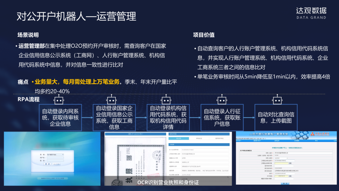 运营管理部在集中处理O2O预约开户审核时,需查询客户在国家企业信用信息公示系统(工商网)、人行账户管理系统、机构信用代码系统中信息,并对信息一致性进行比对。整个流程比较固定但业务量比较大,每个月要处理上万笔业务。在季末或年末时会有20%或者40%的业务量增长。