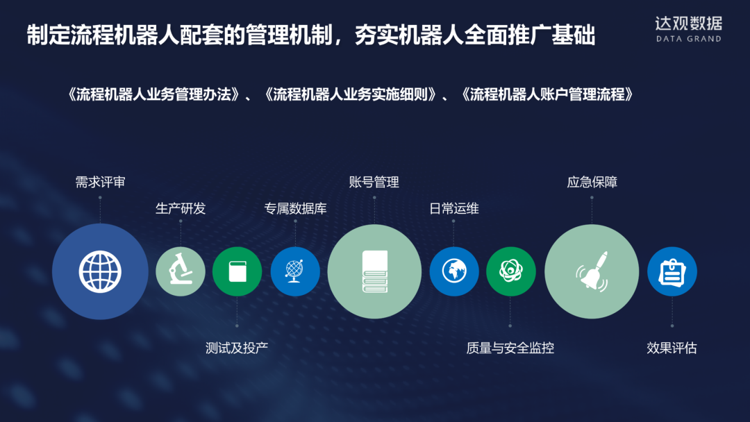 因此,在企业自动化的推广阶段,我们会建议客户建设RPA卓越中心,用来确定各方职责,实现机器人的高效管理和全面推广。另外在组织架构建设基础上,还需要制定配套的机器人管理制度,包括机器人的管理办法、实施细则、账户管理细则等。这其中包括机器人从需求评审到研发、投产、运维的全生命周期管理,奠定RPA在金融机构全面推广的制度基础。