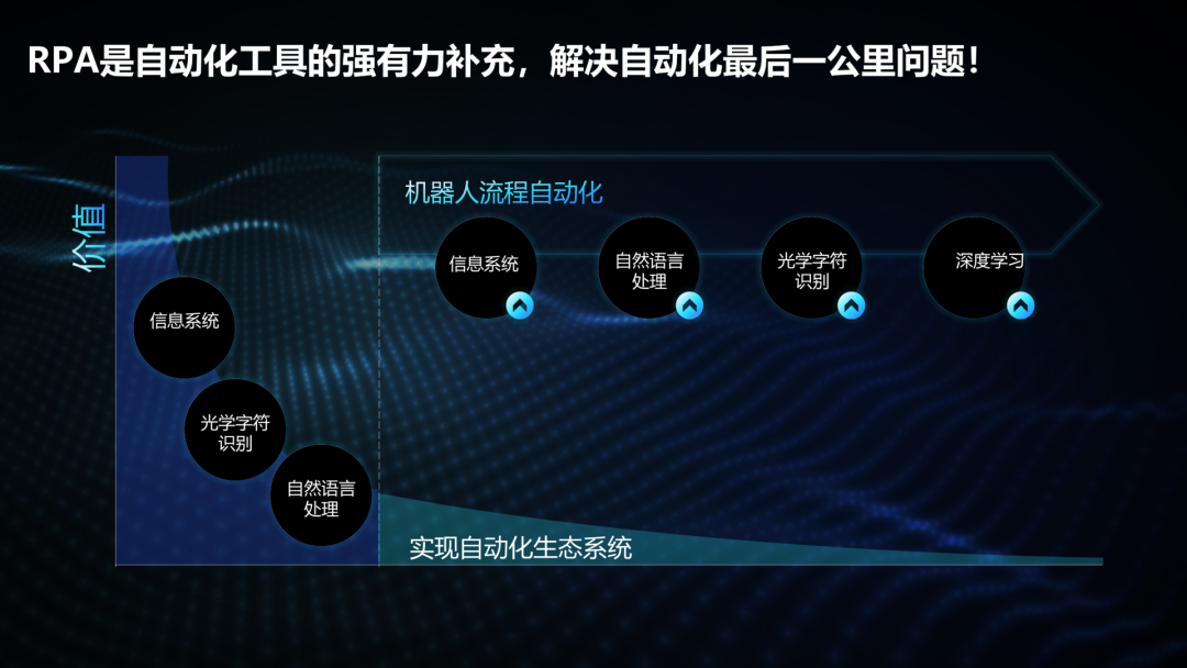 另外,在RPA的实践过程中,经常会有朋友探讨RPA与企业自动化的话题。我的理解是RPA是自动化的其中一种技术工具或手段,信息系统、AI技术等等也是实现企业自动化的工具。结合RPA的技术特点,RPA应该是在企业实现端到端自动化的最后环节,也即是说企业在已完成流程梳理、系统建设的基础上,再引入RPA的技术解决方案,以实现企业自动化旅程的最后一公里的问题,更好的提升金融机构的流程自动化的水平和数字化的水平。