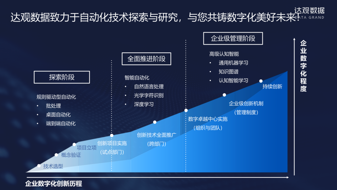 企业数字化的创新历程一般需经历几个阶段,包括技术选型、概念验证、项目立项、试点项目实施、CoE实施、持续推进等过程。在这个过程中,达观致力于自动化技术的探索和研究,与广大客户和朋友共同见证数字化时代美好的未来。