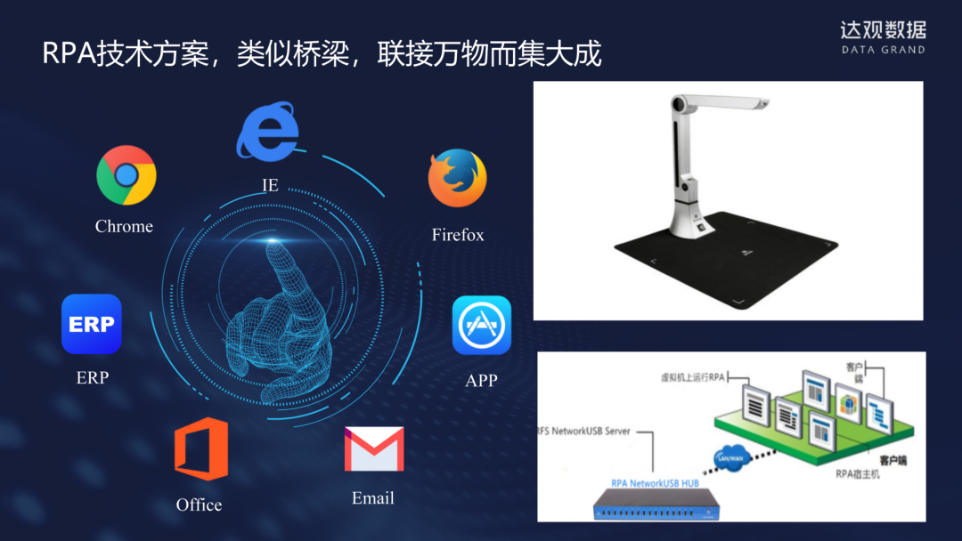 RPA技术方案类似于桥梁,它起到的是连接的作用。RPA不仅连接软件(IE浏览器、ERP系统、第三方APP软件、邮箱、office等),还可以集成Web Service,甚至可以集成硬件设备(扫描仪、USB、HUB等)。