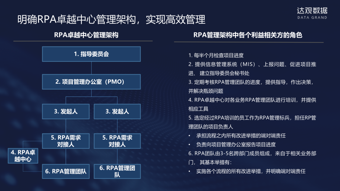 在机器人全面推广阶段,机构一般会建立相应的RPA卓越中心,整个架构包括指导委员会、PMO、业务部门、RPA建设团队等。在管理架构中会明确不同角色对应工作职责,包括例行检查项目进度、RPA团队考核、技术培训、前沿技术研究、供应商管理等。
