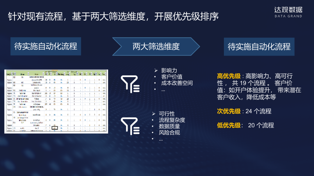 针对现有流程,我们基于两个维度做流程的筛选:第一种维度是从影响力、客户价值、成本改善空间等方面进行流程业务价值筛选,另一种维度是从技术可行性、数据质量、流程复杂度、风险合规等方面进行技术筛选。在这两个维度下,我们会把待实施的自动化流程按照高优先级、次优先级、低优先级的分类进行优先级划分。