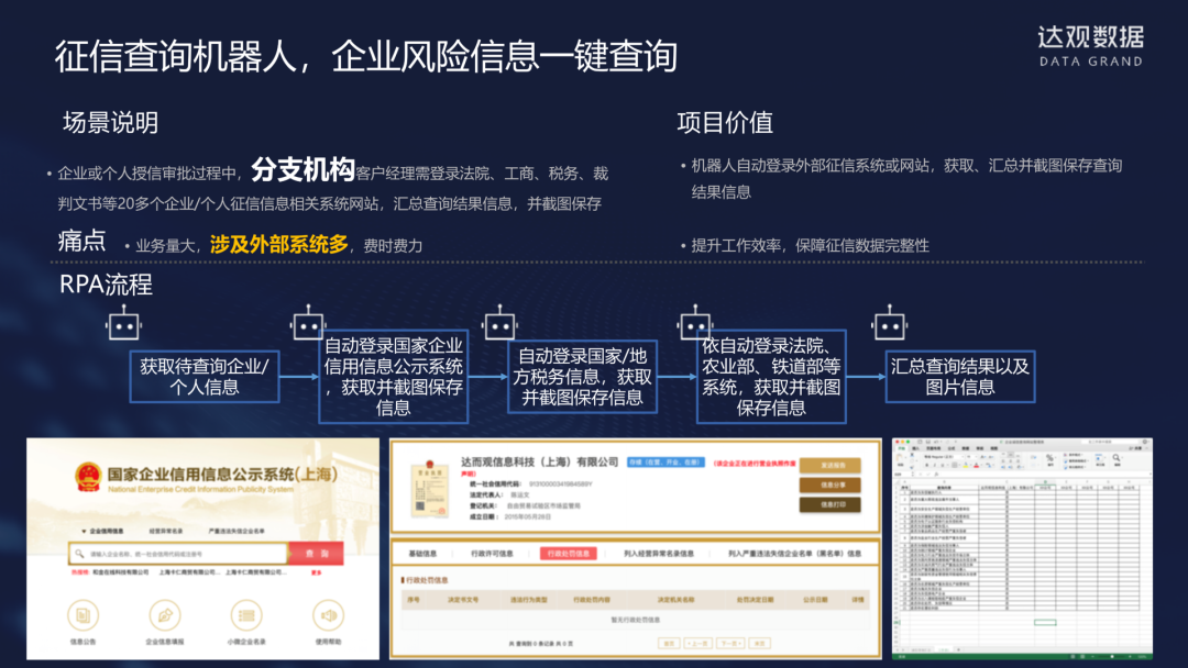 在企业或个人授信审批过程中,客户经理需要登录法院、工商、税务、裁判文书等20多个企业/个人征信信息相关系统网站,汇总查询结果信息。同时,客户经理还要按照合规要求截图保存。业务量大,涉及的外部系统多,整个流程费时费力。