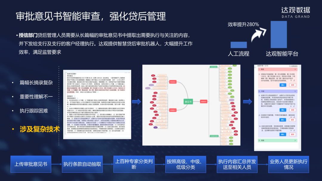 针对这一痛点,达观数据提供了智慧贷后审批机器人解决方案。首先用自然语言处理技术实现审批意见书的关键要素的提取,同时将提取的要素按照高级、中级、低级进行分类,然后再下发给客户经理执行,最后贷后管理人员做执行情况的跟进。在达观智能RPA的帮助下,大幅度提升了经营机构的贷后管理水平,更好地满足了监管机构的合规要求。