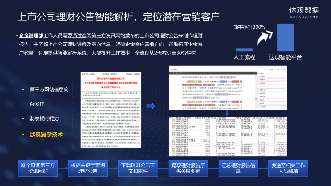 达观数据智能解析机器人首先通过RPA自动登陆网站,下载上市公司的理财公告,然后使用自然语言处理技术抽取关键信息(理财产品名称、股票代码、产品详细信息、产品收益率、产品金额等)——在达观RPA的帮助下,可以将全流程从2天减少至30分钟内。