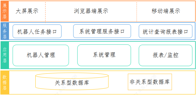 RPA平台为分层架构,如下图所示。其中展示层包括网页、移动端和大屏,服务层提供机器人管理、系统管理以及报表查询接口,应用层完成机器人、系统管理以及报表生成等功能。由于RPA同时有结构化和非结构化的数据,计划同时采用SQL和NOSQL两种数据存储。