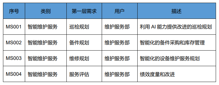 架构师团队和运营团队展开了一系列的研讨后,逐步确定了一个需求目录,他们把这一类服务归类为“智能维护服务”,核心需求包括:使用人工智能技术和物联网数据来降低维护成本和生产中断。这种分析能够有效规避资金和资源投入不当的问题,并且有助于制定出相对准确的预算。同时,也对人员和平台的能力设定了具体的需求。