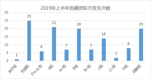 由图2可知,从融资轮次上来看,天使轮次数最多,为25次,占比19%。其次是A轮、B轮和战略轮融资,发生次数分别为21次、20次和20次。