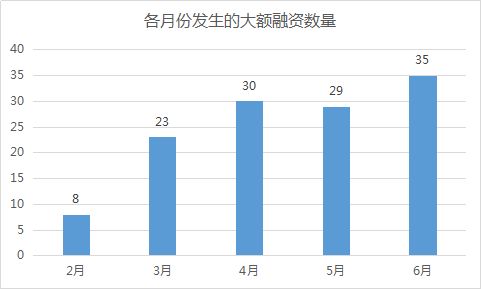 从融资时间来看,由图3可见,从2月到6月,获得大额融资的企业数量分别为8家、23家、30家、29家和35家。大额融资主要集中在第二季度,其中6月最多,为35家企业。2月最少,只有8家企业获得大额融资,这样的时间特征可能与企业生产周期、春节假日等因素有关。