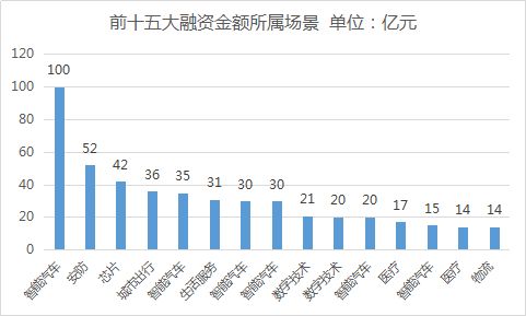 分析发现,数字技术、企业服务、医疗、城市出行、智能汽车和智能制造为获得大额融资数量最多的六大场景,企业数量约占上半年大额融资企业总量的70%。从融资金额方面看,融资金额最大的五个领域分别为智能汽车、安防、芯片、城市出行和生活服务,金额分别为100亿元、52亿元、42亿元、36亿元和31亿元。智能汽车领域企业备受资本青睐,融资额较大:上半年获得大额融资的智能汽车企业共11家,其中6家企业位列前十五之席。除此之外,数字技术场景和医疗场景也在前十五大融资金额中占有重要地位。