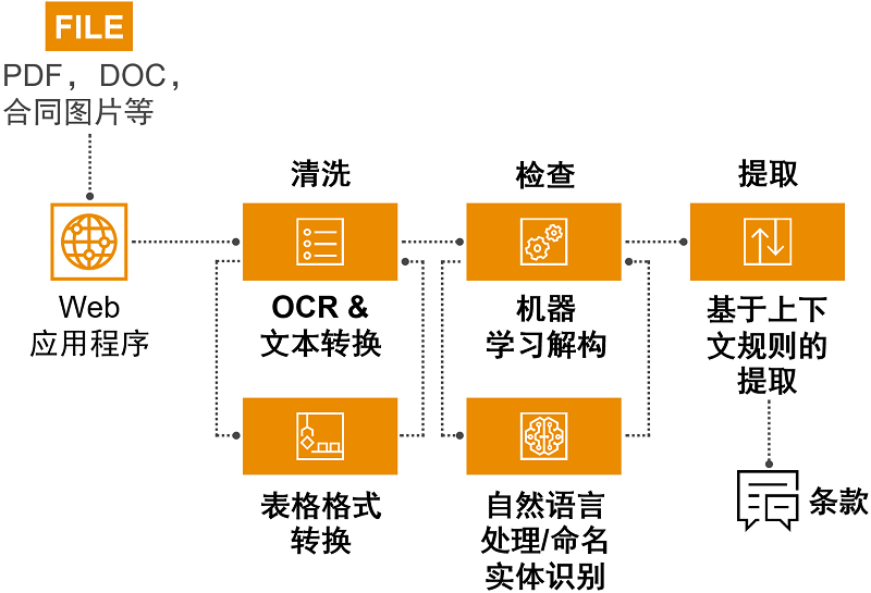 在企业的采购、生产、销售等流程中,往往需要面对大量的合同文档、表格等的审阅及数据录入工作,若仅靠人工识别和录入则需耗费大量时间。但是,通过结合OCR、机器学习、神经网络、深度学习和自然语言处理等技术,可以构建对文档内容进行自动识别并提取、分析关键信息的平台。用户可根据不同的业务场景,制定文档审阅条件和规则以训练定制化的人工智能模型,从而能够自动、快速、可追溯地提取合同信息,并发现合同条款中的潜在风险。